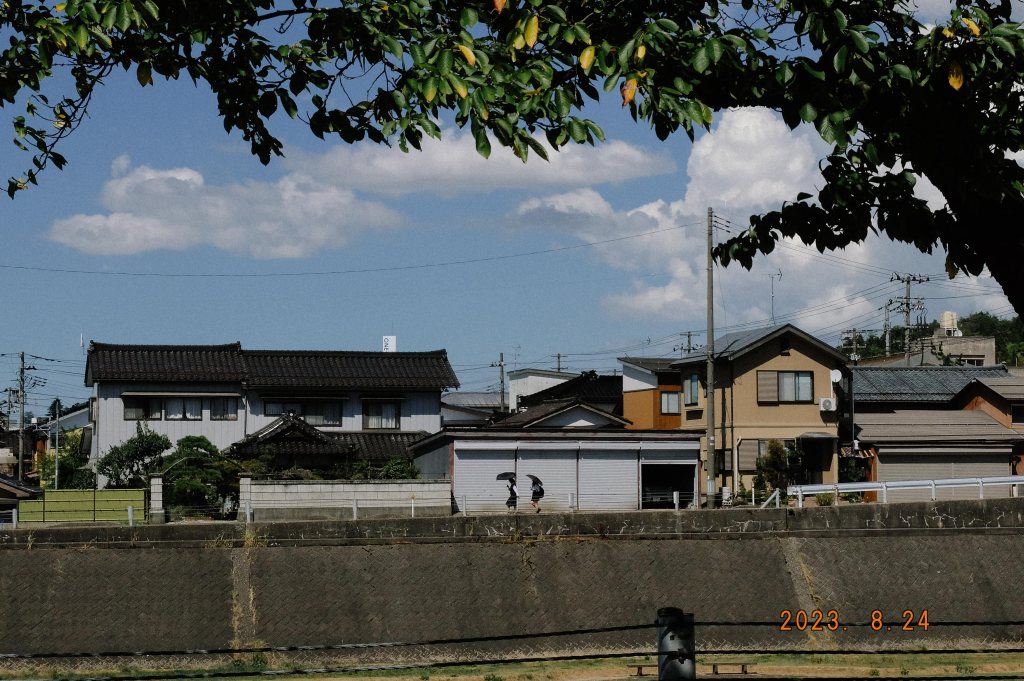 August 24th, Kamo City, Niigata Prefecture. This is the hometown of photographer Shigeo Gocho. Known as the Little Kyoto of Hokuetsu, it was scorching hot on this day. High school students were walking home under parasols.