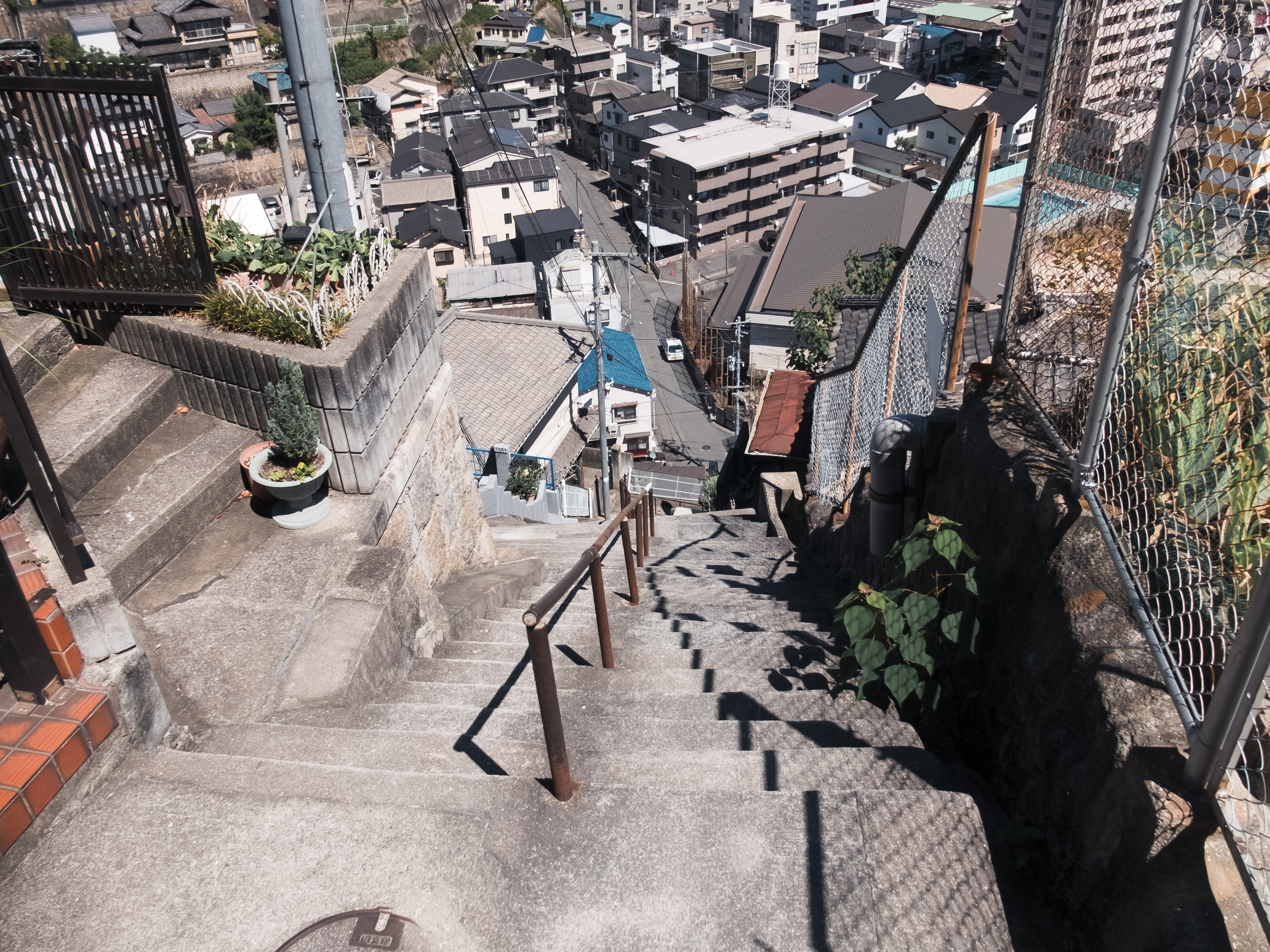 The city of Kure is famous for its steep and hilly terrain, a result of having very little flat land. Much of the limited flat ground was used by the Imperial Japanese Navy as military bases, leaving citizens to build their homes on the hillsides. The “Two Hundred Steps” in the Ryojo district were built as a vital path for residents to navigate their daily lives on these slopes. Many of the Navy’s officers also resided in this area.
